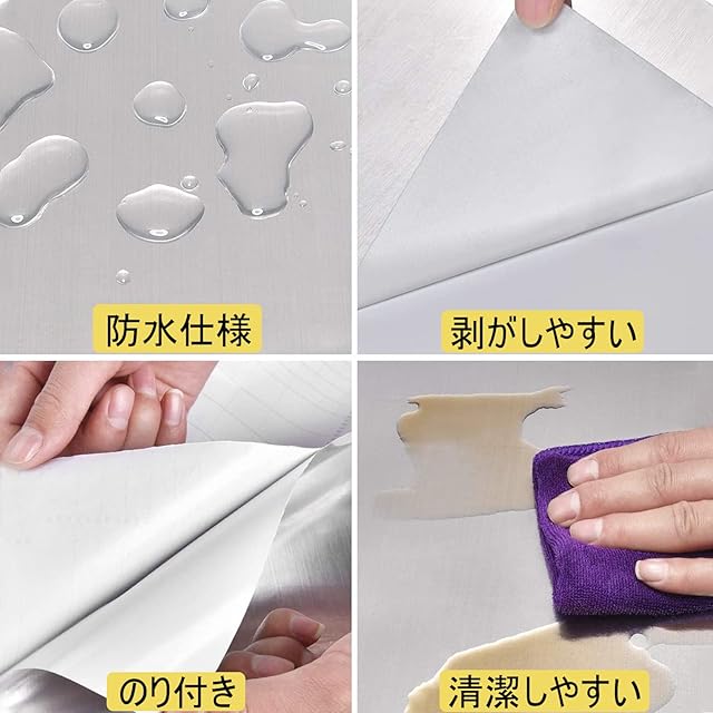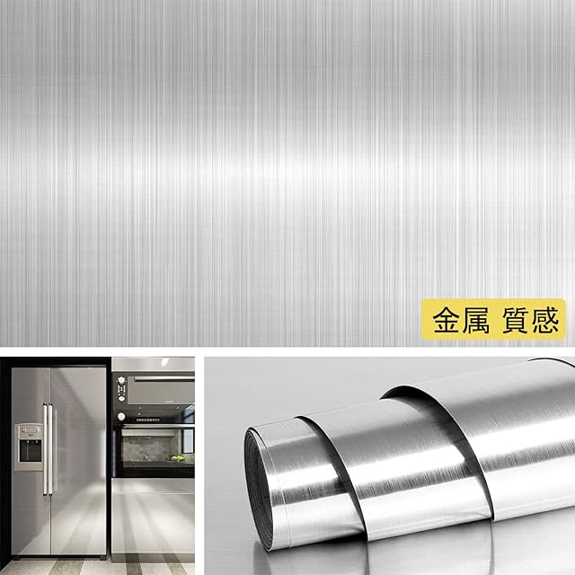 【仕様】●サイズ:幅0.4m x 長さ5m ●厚さ:約0.22mm ●タイプ:ステンレス 金属 ●素材:塩化ビニル(PVC) ●色:シルバー ●防水防油 ●のり付き