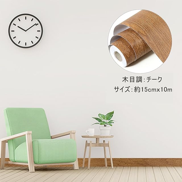 【仕様】サイズ:約15cmx10m 厚さ:約0.25mm 素材:PVC 表面処理方法:エンボス加工 木目調:チーク 内容物:マスキングテープ、おさえヘラ