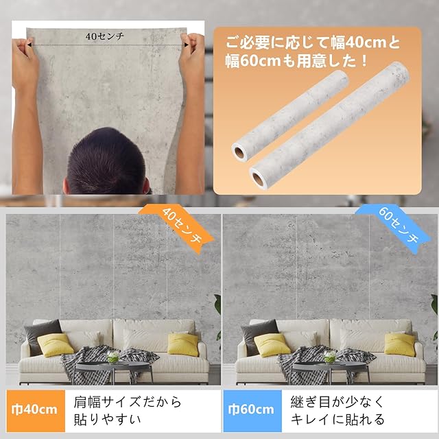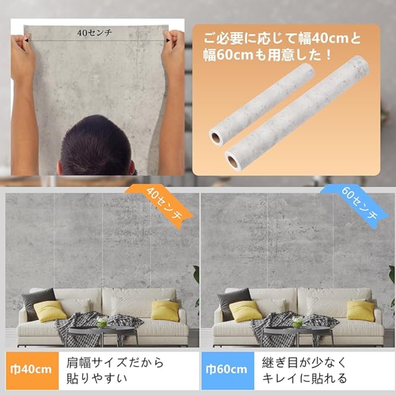 商品の詳細:サイズ:横巾40 cm×長さ10 cm/巻 厚み:約0.25 mm(裏紙を含め) デザイン:コンクリート柄 素材:PVCと裏紙(透けない素材)