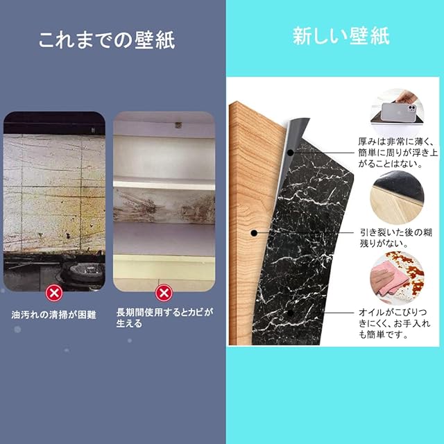 【耐熱・防油・防カビ】表面はPVC撥水加工で、水回りでも使えます。油跳ねのコンロ周辺も清潔に保ちます。防カビにもなる長持ちの一枚です。pvc素材特有の匂いが生じる可能性がありますが、時間が経つとだんだんなくなります。