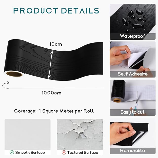 VEELIKE マスキングテープ 広幅 木目 黒 木目 マスキング テープ 壁紙 自粘着 木目シート 木目調シール 窓枠用リメイクシート 黒 インテリア リフォーム 木目調カッティングシート 防水 耐熱 PVC材 エンボス加工 DIY装飾 補修 厚手 防汚 耐摩擦 剥がせる のり付き はがせる 巾木 木口 ふすま 襖 ドア 食器棚 キッチン トイレ 和風 おしゃれ ブラック 10cmx10m | ascend