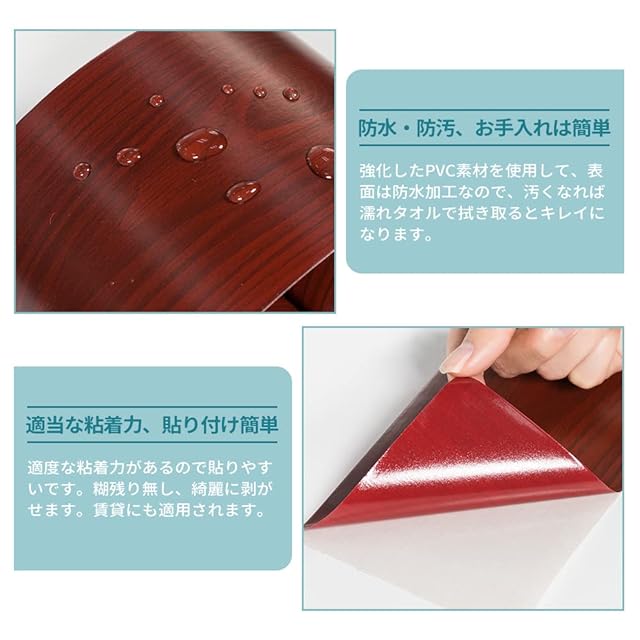 【防水防汚、掃除が簡単】幅広マスキングテープは優れた強化PVC素材を採用して、耐热性や耐久性が優れています。防水・防汚性も良く、汚くなれば濡れタオルで拭き取るとキレイになります。キッチン、洗面所水回りでもご使用できるリメイクシート 木目です。