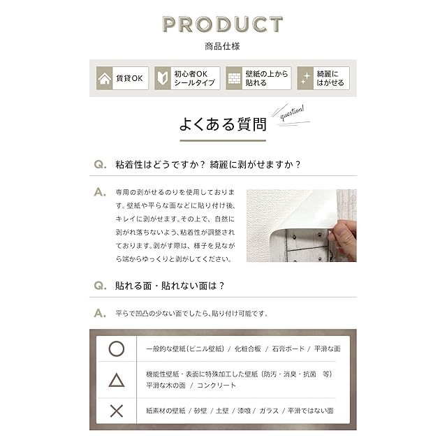 【賃貸もOK】粘着力がありながら綺麗に剥がせるのりを採用しているので現状回復が必要な賃貸にも安心。汚れも拭き取り易く、今貼ってある壁紙クロスの傷汚れ隠し、キッチン扉や引き出しの装飾、補修にもおすすめ。