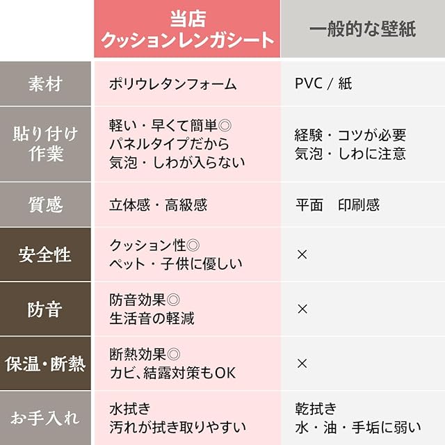 【商品の特徴】軽くてやわらかいクッションタイプの壁紙です。粘着シールのため台紙を剥がして壁に貼るだけ。好きな部分でカット出来るので、スペースに合わせて簡単に模様替えできます。