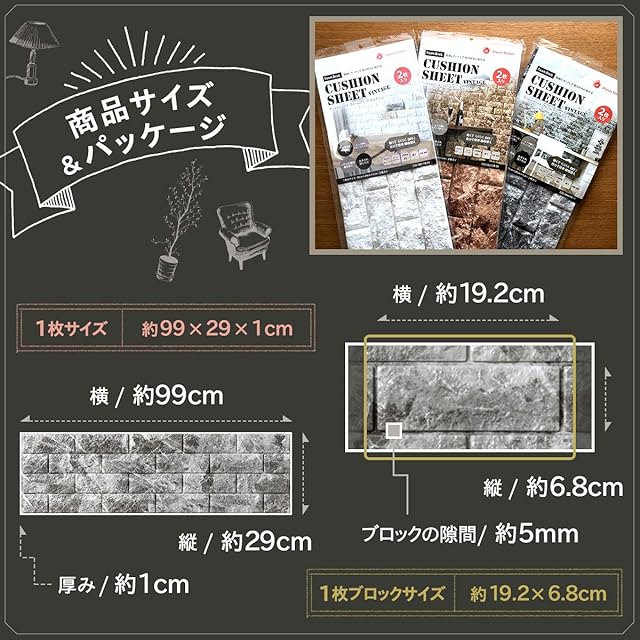 【貼れる場所】一般壁紙・タイル・木材・石膏ボード・コンクリート【使用実績】飲食店、保育園、託児所、病院、事務所、展示場、撮影現場【サイズ】1枚のサイズ(横)約99cm×(縦)29cm×(厚さ)1cm