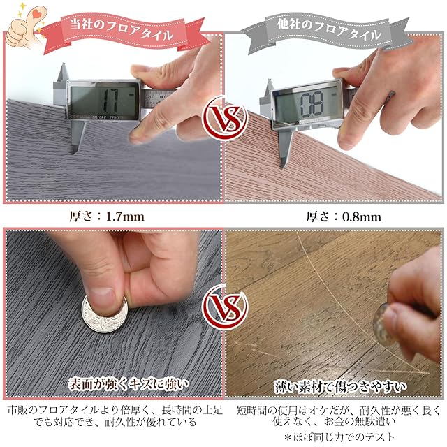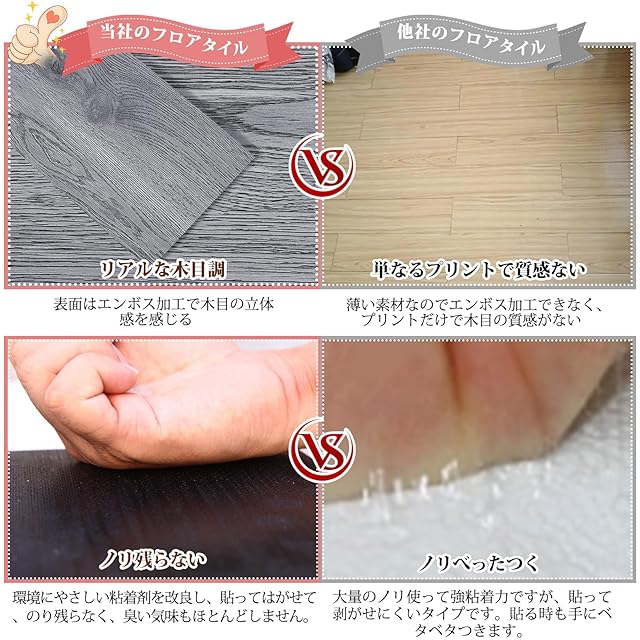 ご注意:強粘性のため剥がすときに若干接着剤が残るかもしれません。賃貸の方や回復希望する場合は貼る前にCFシートや養生テープなどで床に貼ってからフロアタイルをお貼りください。回復が必要な場合必ずご検討の上お買い求めください!