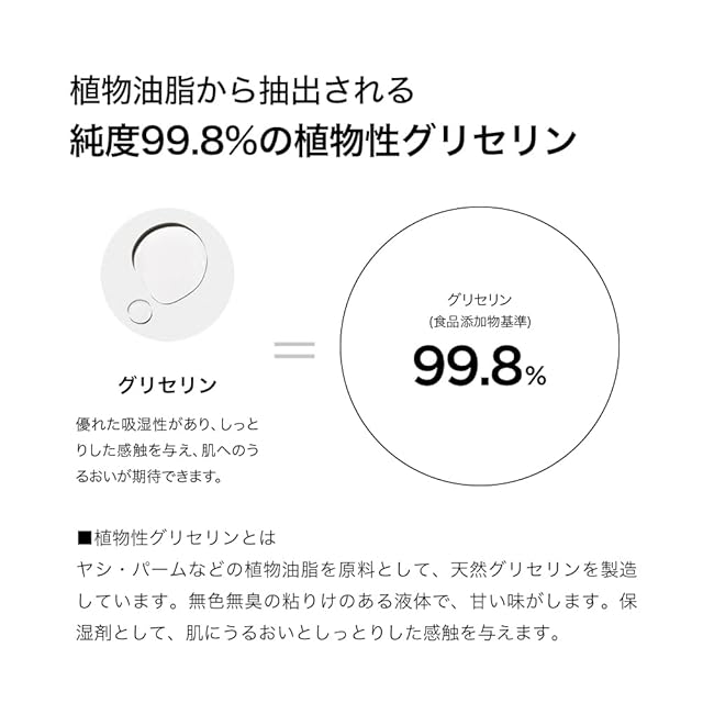 【植物性グリセリン/ベジタブルグリセリン】:植物性グリセリンには、優れた吸湿性があり、しっとりした感触を与え、角質層の水分をキープすることで肌へのうるおいが期待できます。