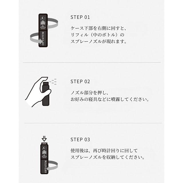 【使用方法】ベッドに入る前に、枕元や布団カバー、シーツ、カーテンなどに20cmほど離して2〜3回噴射してください。※ソファやクッションなどのファブリック製品にもお使いいただけます。