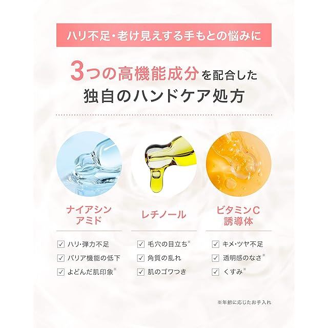 ✅【手元専用のエイジングケア】年齢の出やすい手元のエイジングケアをサポート。ナイアシンアミド/レチノール/ビタミンC誘導体/発酵原液カクテル、話題の美容成分を配合。さらに、高麗人参エキス、ヒアルロン酸、セラミドも配合し、手元の集中ケア。さらさら、すべすべしたうれしい手に導きます。