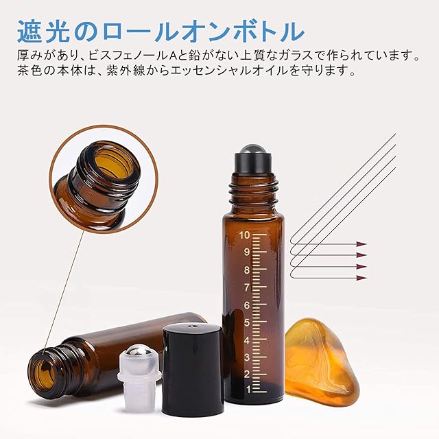 【便利なロールオンタイプ】香水やアロマオイル、精油などの小分け、保存に便利なアトマイザーです。先端にスチールボールが付いているので、つけすぎを防止しつつ、狙った箇所にピンポイントでお使い頂けます。