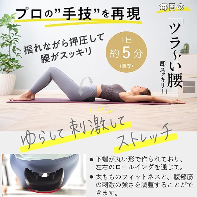 【腰がリラックス!】長時間のデスクワークやリモートワーク、スマホでの作業で、いつの間にか背中の筋肉が硬くなりましたか? ゆっくりと揺れさせるだけで、腰がリラックスする、リハビリテーション士が開発したセルフマッサージグッズです。