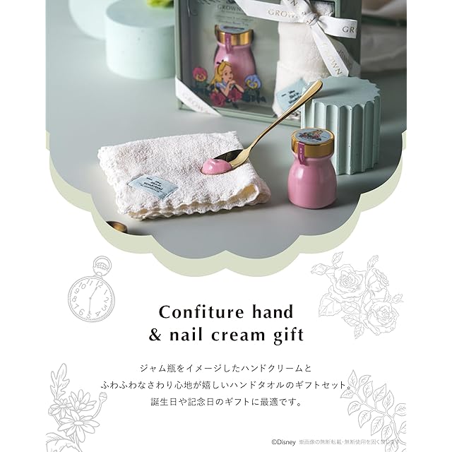 ●甘く優しい香りに包まれるバスフレグランスブランド「Sweets maison」。「GROWN UP」は、大人っぽい印象を与える落ち着きのある香りとニュアンスカラーが特徴のシリーズ<br>●「ふしぎの国のアリス」のお茶会をイメージしたボディケアアイテム。そのままプレゼントとして贈れるギフトボックス仕様<br>●ジャム瓶をイメージしたハンドクリームとふわふわなさわり心地が嬉しいハンドタオルのギフトセット<br>●誕生日や記念日などのギフトに最適<br>●香りは、甘く華やかなガーデンローズティーの香り