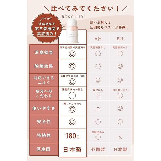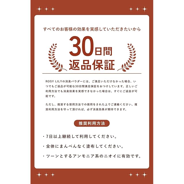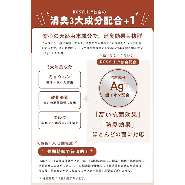 【Ag+(銀イオン)配合で、さらに強力】ROSYLILYの消臭パウダーは一般的な消臭パウダーに含まれる成分に加え、銀イオンを配合。Ag+が抗菌作用を施し、よりパワーアップした消臭効果を期待できます。また、日本製にこだわり、環境に優しい天然素材を使用しています。