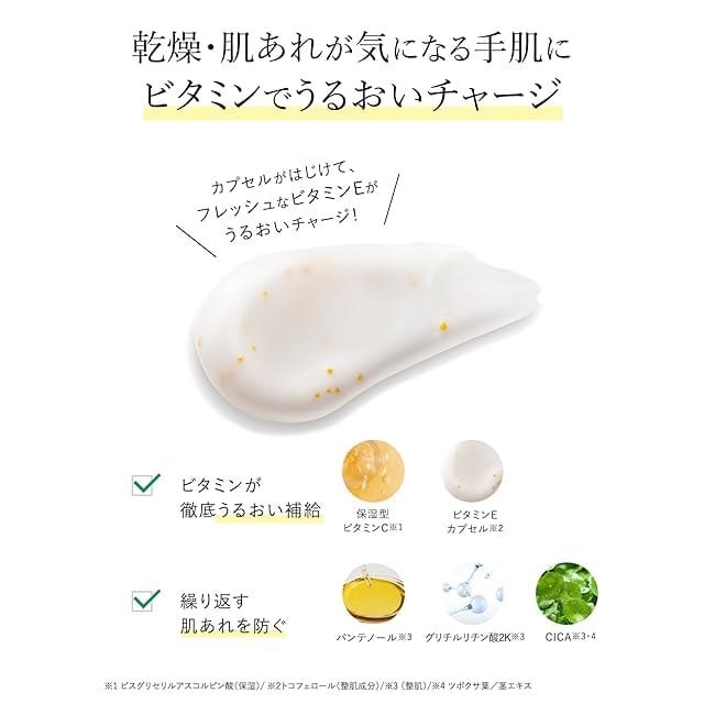【ビタミンが徹底うるおい補給】カプセル化したビタミンE*1がフレッシュな状態で手肌ではじけ、角層すみずみまで浸透します。さらに保湿型ビタミンC*2が乾燥しがちな手肌にうるおいをキープします。*1 トコフェロール(整肌成分)/*2 ビスグリセリルアスコルビン酸(保湿)