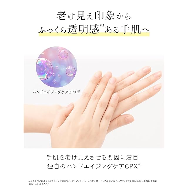 【老け見え印象から、ふっくら透明感*1のある手肌へ】手肌への有用性が確認されたヒメフウロエキスや、ナイアシンアミド、次世代*2レチノール様成分のバクチオールなどを独自にブレンドしたハンドエイジングケアCPX*3を搭載。ふっくら透明感ある手肌へ導きます。*1 うるおいを与えた肌表面のキメが整った状態のこと/*2 自社比/*3 ヒメフウロエキス、ナイアシンアミド、バクチオール、グルコシルヘスペリジン(整肌)、年齢を重ねた手肌にうるおいを与えること