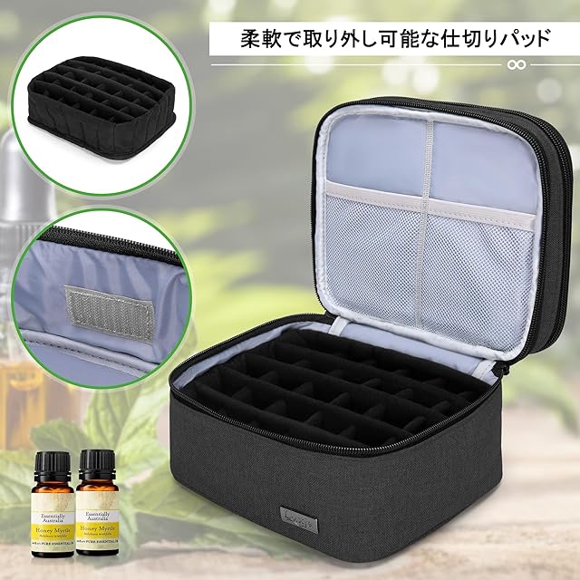 仕切りが柔軟で調整可能です。エッセンシャルオイル5ml - 30mlのボトルを合計20本分を収納することができます。