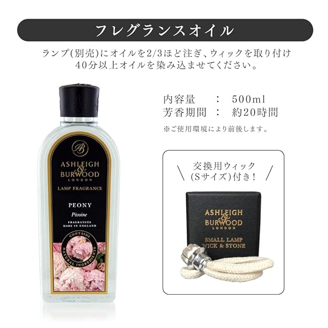 アシュレイ&バーウッド(Ashleigh&Burwood) ランプフレグランス ピオニー 500ml 詰め替え 交換用ウィック(Sサイズ)付き フレグランスオイル ディフューザー
