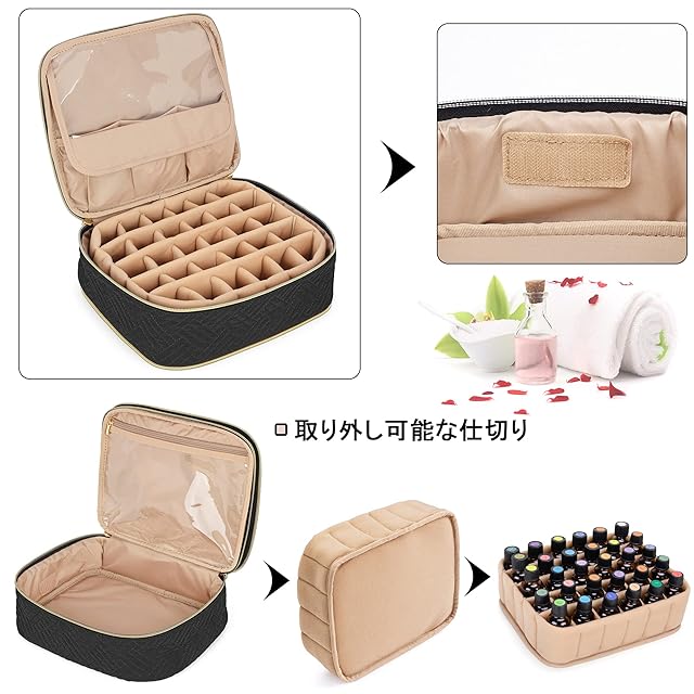 取り外し可能なデザイン:上下二段の間はファスナーで接続されているので、2つのアロマケースとして使用することができます。各ケースにはオイルを最大30本収納することができます。