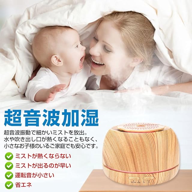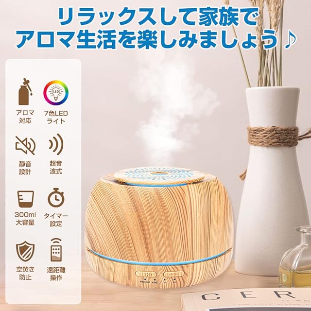 Besince ディフューザー 加湿器 アロマディフューザー 卓上 アロマ加湿器 超音波式加湿器 卓上加湿器 静音 タイマー LEDライト7色 リモコン付 乾燥対策 300ml オフィス用 家庭用 保湿 (ウッド) | ascend