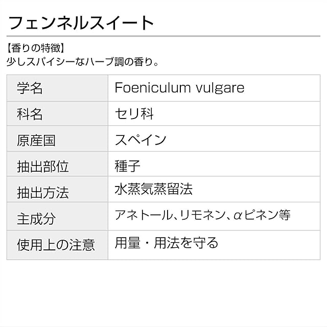 【学名】Foeniculum vulgare dulce 【科名】セリ科 【原産国】スペイン