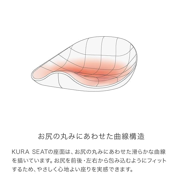 【立体 座面 がお尻をサポート】KURASEATの座面は、お尻の丸みにあわせた滑らかな 曲線を描いています。 椅子 の平らな座面と違い、お尻を前後・左右から包み込むように フィット するため、やさしく 心地よい座りを実感できます。KURA SEATを使用することで美しい 姿勢 へ導かれ、偏っていた座面への体圧を分散し、お尻への 負担 が軽減されます。