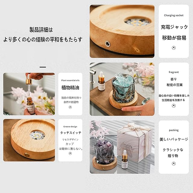 エッセンシャルオイルとチャージベースの使い方:強い香りがお好きな方は、一度に8~12滴のエッセンシャルオイルを、軽い香りがお好きな方は、一度に5~8滴のエッセンシャルオイルを加えてください。 室温はディフューザーストーンの揮発性に影響を与えます! タッチスイッチ充電ベース、使いやすい、光が薄暗いときにインスタント充電!