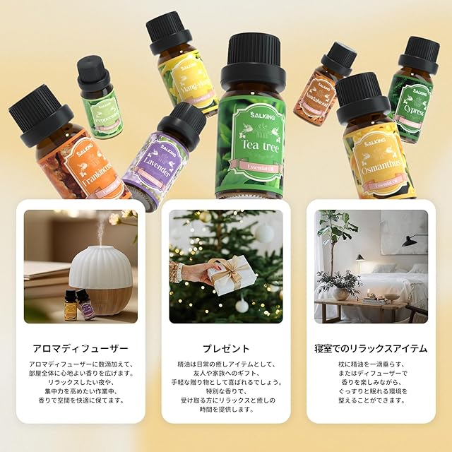 【プレゼントにもぴったりの高品質精油 & 安心のアフターサービス】SALKING 精油は、洗練されたパッケージと高品質な内容で、誕生日や特別な日のギフトにも最適です。大切な人にリラックスと癒しを届けるプレゼントとしてぴったり。また、ご購入後の安心サポートも充実。万が一の不具合や疑問がございましたら、迅速な対応をお約束します。お客様の満足を第一に考えたアフターサービスで、安心してお使いいただけます。