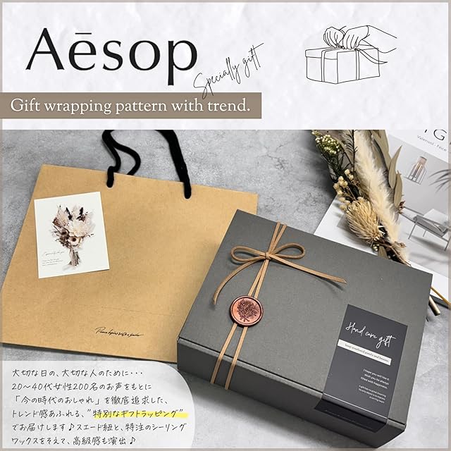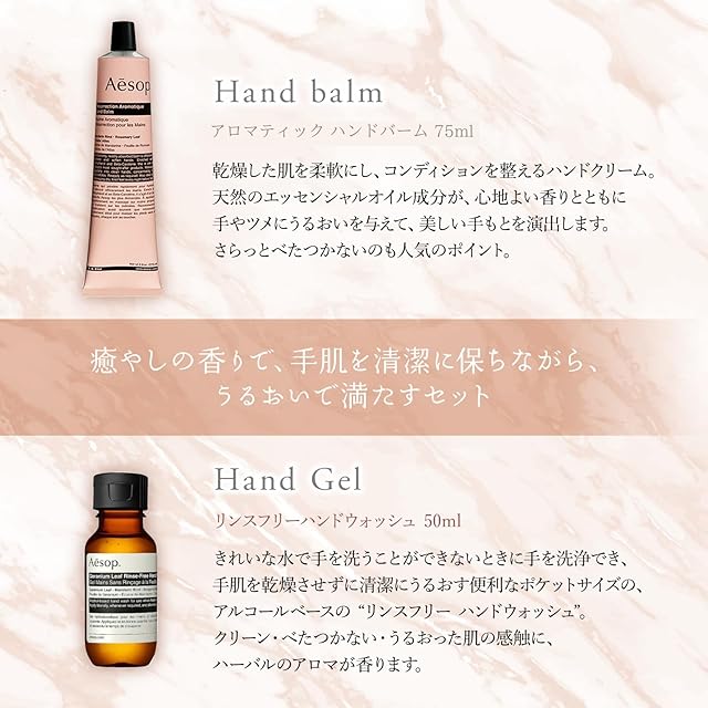 【セット内容】①アロマティックハンドバーム (ハンドクリーム):75ml ②リンスフリー ハンドウォッシュ(リンスフリーハンドジェル):50ml ③巾着 ショッパー ④オリジナルギフトボックス ⑤オリジナルお手提げ ⑥オリジナルメッセージカード⑦フェイスパック1枚