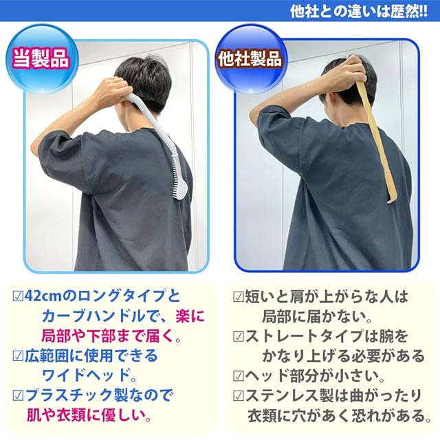 ・二段階でカーブ構造により肩が上がりにくい人でもピンポイントでかゆいところに届く ・四十肩/五十肩で腕が上がらない方、妊婦さん、腕や肩の手術をした方に最適