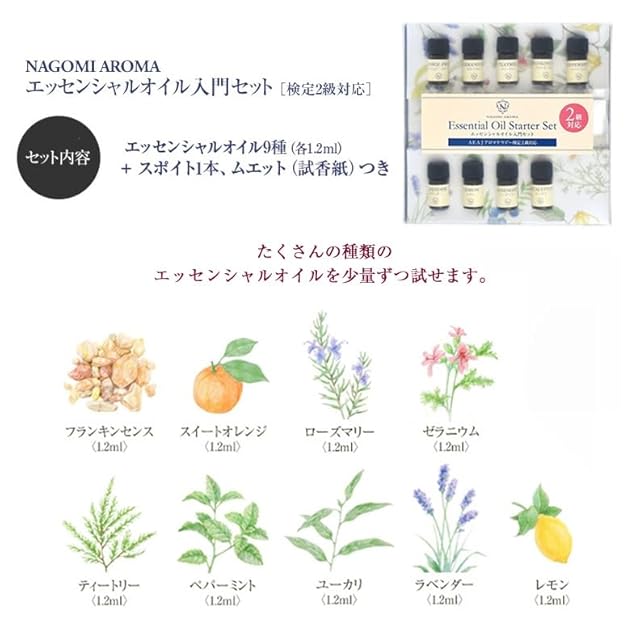 アロマ検定の対象となっている精油の香りを試してみたい方、最近アロマに興味をもったばかりでいろいろな香りを嗅いでみたい方におすすめのセットです。[セット内容] テキスト(日本アロマ環境協会発行 公式テキスト)、問題集(日本アロマ環境協会発行 公式問題集)、1級対応精油(8種)、 2級対応精油(9種)