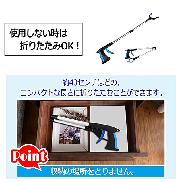 握力の弱い方、麻痺のある方に。また腰痛や膝の痛みでしゃがめない方に。高いところから低いところまで、物をつかむのに役立つマジックハンドです。室内の用事から、外のごみ拾いまで。幅広いシーンでご活用いただけます。