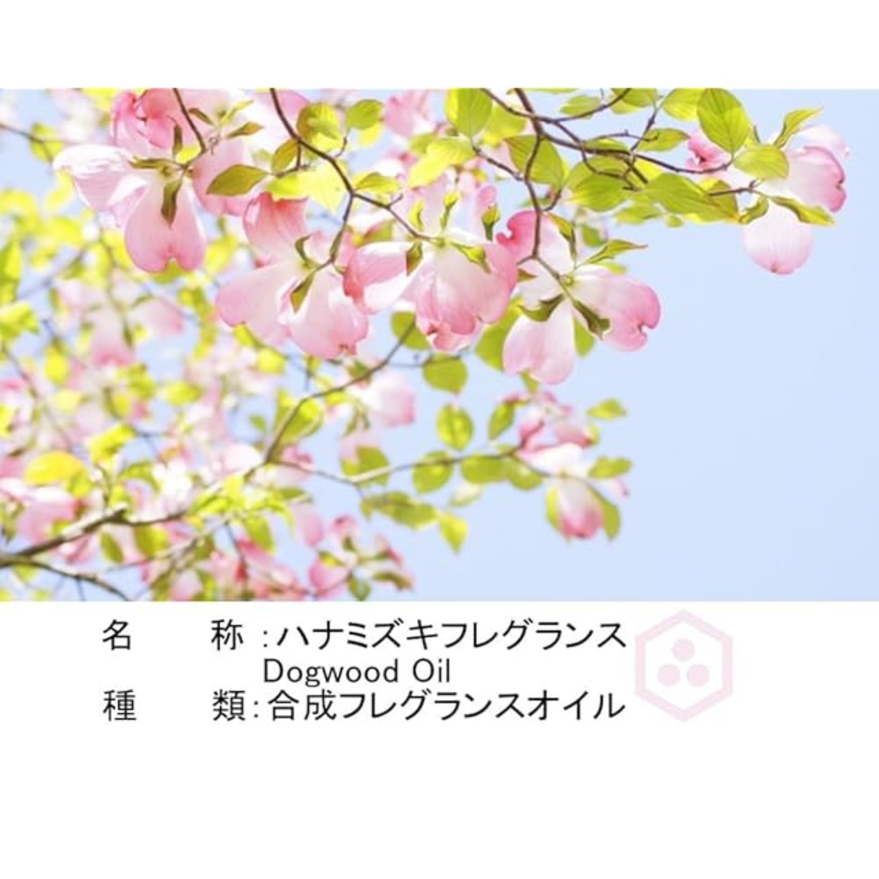 種類:ハナミズキ合成フレグランスオイル ※ハナミズキ(ミズキ属)の花の香りを参考にイミテーションフレグランスとして完成させました。ハナミズキそのものの精油ではありません。
