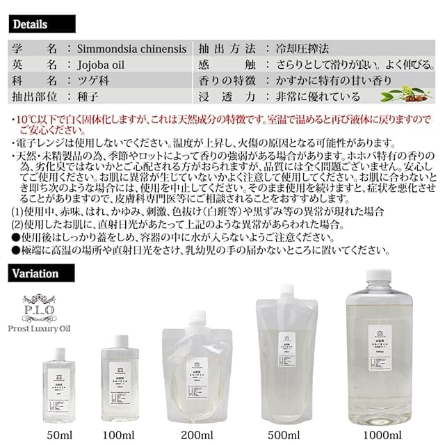 【商品内容】<br />Prost Luxury Oil 高精製ホホバオイル(低刺激タイプ) 1000ml <br /><br />【商品説明】<br />スキンケアやボディケアの強い味方です。<br />ホホバの木は砂漠という過酷な環境で、水無しで2年以上生きると言われています。その秘密は「ワックスエステル」という成分で、強烈な太陽の日差しから自らを守ることが出来るのです。<br />ワックスエステルを豊富に含むのは、植物オイルの中でも唯一、ホホバオイルだけです。<br />私たちの肌は「皮脂膜」で被われていて、このおかげで肌の弾力と潤いが保たれています。<br />「皮脂膜」には約20%~30%の「ワックスエステル」が含まれています。<br />だから、人の肌に素早く馴染んで、弾力と潤いを保つことが出来ます。<br /><br />【特徴】<br />学名:Simmondsia chinensis<br />英名:Jojoba oil<br />科名:ツゲ科<br />感触:さらりとして滑りが良い。よく伸びる。<br />浸透力:非常に優れている<br />香りの特徴:低臭。ほとんど感じない。<br />抽出部位:種子<br />油製造方法:冷却圧搾法<br /><br />【P.L.O 高精製ホホバオイルのこだわり】<br />精製しているので低刺激でお肌に優しいオイルです。<br />酸化・変質しにくく、長期保存できます。<br />生産地から航空便でフレッシュな状態で輸入、自社工場の専用充填機でパッキング、ハイクオリティーな商品をお求めやすい販売価格でお届けします。<br /><br />【ご使用上の注意】<br />・10℃以下で白く固体化しますが、これは天然成分の特徴です。室温で温めると再び液体に戻りますのでご安心ください。<br />・電子レンジは使用しないでください。温度が上昇し、火傷の原因となる可能性があります。<br />・天然・未精製品の為、季節やロットによって香りの強弱がある場合があります。ホホバ特有の香りの為、劣化臭ではないかとご心配される方がおられますが、品質には全く問題ございません。安心してご使用ください。<br />お肌に異常が生じていないかよく注意して使用してください。お肌に合わないとき即ち次のような場合には、使用を中止してください。そのまま使用を続けますと、症状を悪化させることがありますので、皮膚科専門医等にご相談されることをおすすめします。<br />(1)使用中、赤味、はれ、かゆみ、刺激、色抜け(白班等)や黒ずみ等の異常が現れた場合(2)使用したお肌に、直射日光があたって上記のような異常があらわれた場合。<br />●使用後はしっかり蓋をしめ、容器の中に水が入らないようご注意ください。<br />●極端に高温の場所や直射日光をさけ、乳幼児の手の届かないところに置いてください。