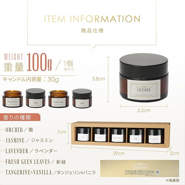 5種類のラインナップ ・癒しの王道:ラベンダー〈Lavender〉トップ:ラベンダー/ミドル:モス/ベース:ユーカリ・バーベナ ・気品あふれる高貴な香り:蘭〈Orchid〉トップ:モカラ/ミドル:蘭・ベチバー/ベース:白ゆり・ミント ・爽やかな柑橘系ですっきり:タンジェリン&バニラ〈Tangerine & Vanilla〉トップ:アンバー・杉/ミドル タンジェリン/ベース サンダルウッド・バニラ ・思わず深呼吸したくなる:新緑〈Fresh geen leaves〉トップ:コリアンダー・もも・レモン・ネロリオイル・タンジェリン/ミドル:アヤメ・ライラック・ジャスミン・依蘭・鈴蘭・バラ/ベース:アンバー・サンダルウッド・トンカ豆・ミルラ・ムスク・安息香・ベチバー・バニラ ・香りの王様:ジャスミン〈Jasmine〉トップ:マリーゴールド・レモン/ミドル:ジャスミン・依蘭/ベース 安息香・バニラ・アンバー ラグジュアリー感があり、どの香りにも癒されること間違いなし。