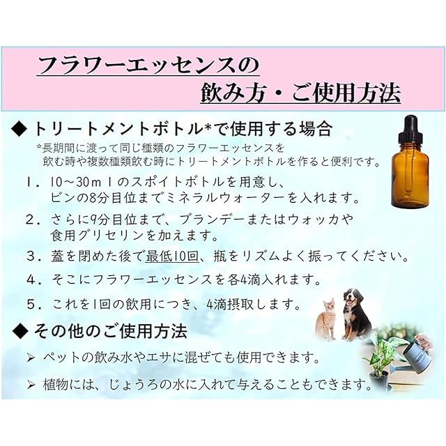【便利な使い方】1回:4〜5滴 300ml〜500mlの水筒やペットボトルにお水(その他の飲み物でも可)を入れ、その中にフラワーエッセンスを4〜5滴を垂らす。それを1日かけて頻繁に飲用ください。※必ず作ったその日に飲み切ってください。