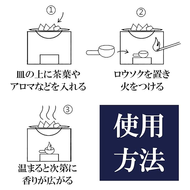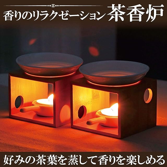 香りのリラクゼーション茶香炉:好みの茶葉を陶器皿に乗せ、ろうそくで燻すことでお茶の香りを楽しむことができます。茶葉には香りのリラクゼーションに加えて、空気を消臭する働きもあると言われています。茶葉の他にもアロマオイルやコーヒーの粉などを燻すことも可能です。