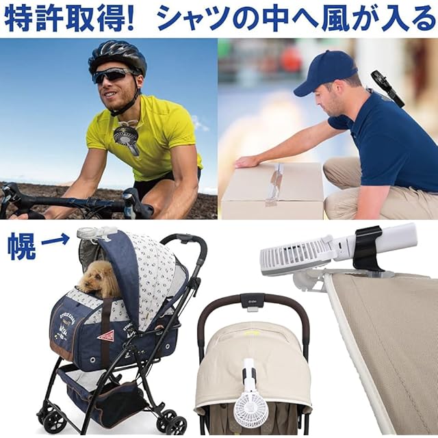 東京ファン株式会社が特許取得した「エアシャツ用クリップ」が付属しています。シャツの襟に掛けると、クリップのウイングによって風がシャツの中に入ります。
