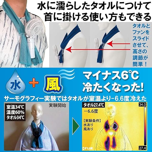 3インチファン(白)は中国製で幅9cm,重さ138g,手持ち使用も可能です。エアシャツ用クリップは日本製(ポリプロピレンとABSを使用、無色半透明、37g)です。風量は3段階で調節可能です。