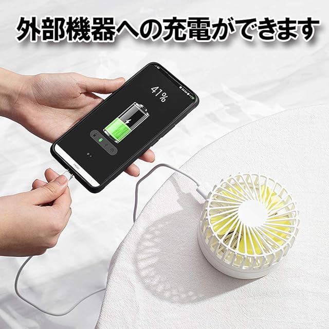 軽量コンパクトな折りたたみ扇風機です。 最新のType-C USBポートを搭載し、内蔵の2000mAh大容量バッテリーを高速充電。 フル充電で連続8時間駆動というロングライフを実現しています。 さらに外部機器を充電可能なType-A出力ポートも搭載していますので、急なスマホのバッテリー切れといった時にも活躍します。