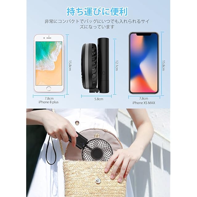❄【持ち運びに便利】本体サイズは23cm×10.7cm×3.8cmと非常にコンパクト、重さはたったの245g、また折畳み可能なデザインで、バッグにも収納しやすいので、うちわのように持って使うタイプ、混雑する場所でも使いやすい、また最大20時間使えるので、毎日の通勤・通学から、ピクニックやフェスなど屋外のイベントでも1日を通して使うことができます。携帯扇風機は高強度ABS材質を採用し、耐圧強度抜群で、変形と崩壊を防ぐことができます。細密な防護カバーの安全設計のため、赤ちゃんの指などの挿入も防げて、事故・ケガを防ぐことができます。