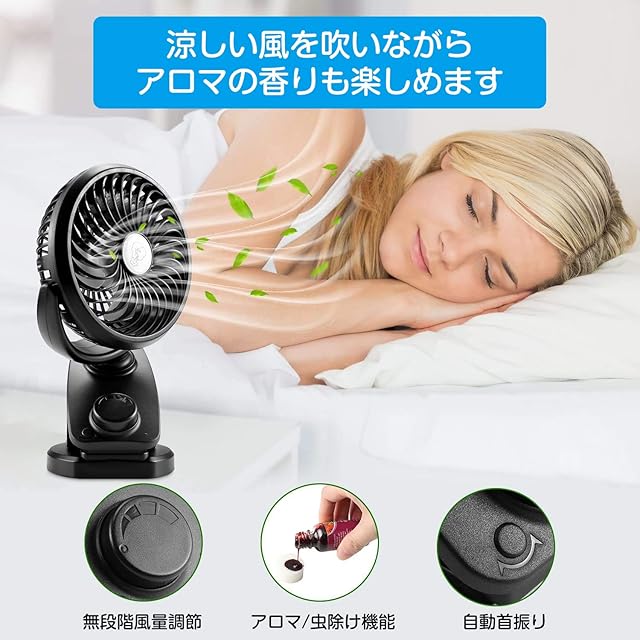 【自動首振り&最大60時間連続使用】Vanazo 卓上扇風機 USB扇風機 無段階風量調節 クリップ 卓上 最大60時間連続使用 usb充電式 静音 6畳 強風 小型 USBファン パワフル送風 アロマ/虫除け機能 専用スポンジ付属 仕様:16.5x23cm | ascend