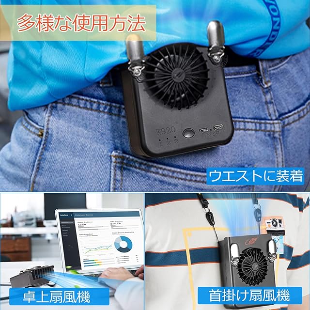 【服を巻き込まないクリップ設計】ウエストに装着しただけで作業服でも私服でも即席的な空調服になる!裾を止めるクリップが金属製でしっかりして服を留め、大きな動きでも外れません。外気を取り入れ、汗の蒸発を促して、体温が効率的に下がる。屋外などエアコンや扇風機が使えないような場所でこのせんぷうき扇風機を使用すると涼しく過ごせる