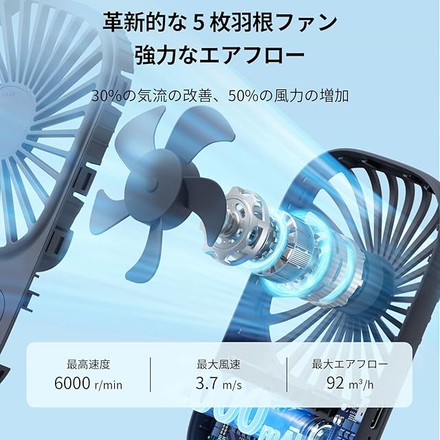【高品質な設計】JISULIFE携帯扇風機本体は高品質のPC素材を採用しており、耐摩耗性と臭いのない耐久性があり、細かいDCブラシレスモーターを内蔵し、低騒音運転は、回転慣性の原理を使用して、弧状のブレードがより強力に回転して、より親密です。