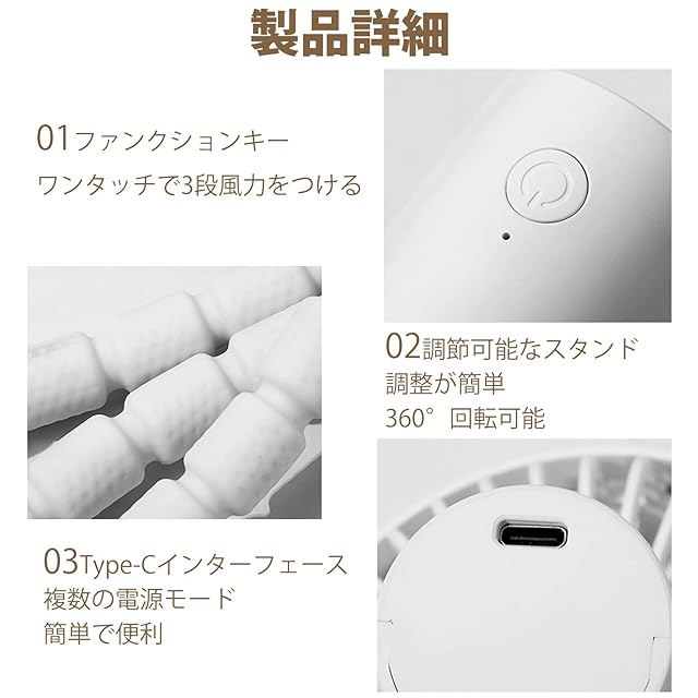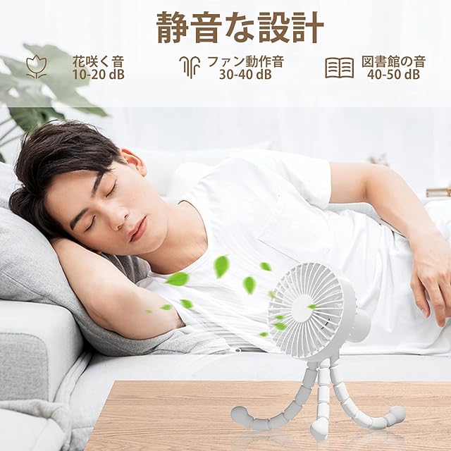 【4in1携帯扇風機&多用途】:扇風機の足がフレキシブルで自由自在に動かせるので、どこにでもつけやすい。「卓上・吊り下げ・手持ち・巻き付け」4つの機能を備えています。デスクで使用する場合は、携帯電話やタブレットのスタンドとして使えます。ベビーカー、ベビーベッド、自転車、車内の後部座席、ジム、キャンプでの携帯扇風機として最適です。どこでも自由に使用でき、真夏になったら大活躍しています。かわいい見た目、プレゼントで友人や家族に喜ばれる小型扇風機です。