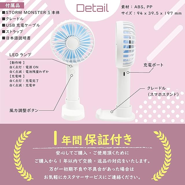 STORM MONSTER S ミニ扇風機 卓上扇風機 手持ちファン USB充電式 自立型 スマホスタンド (FROZEN WHITE) | ascend