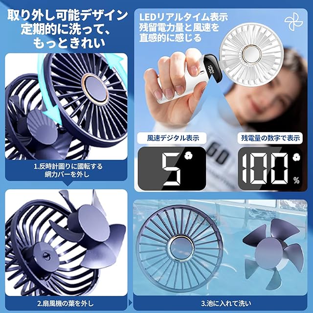 【LED電池残量表示&90°折り畳み式】携帯扇風機は電池残量表示があるのでとても便利です。搭載されたLEDディスプレイは、バッテリー残量がと風速一目で分かるフレンドリー設計、電池残量を細かく把握でき、充電のタイミングも分かりやすくなります。90度調整可能で折りたためばコンパクトになるので携帯に便利です。バッグやポケットの中に入れても負担になりません。また、携帯便利で、蒸し暑い夏でも、手っ取り早く涼しくなれます。様々な夏の活動を楽に参加出来ます。