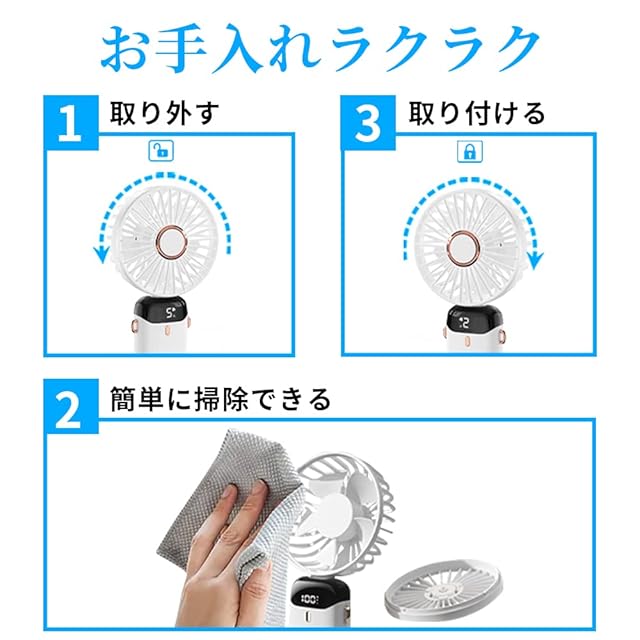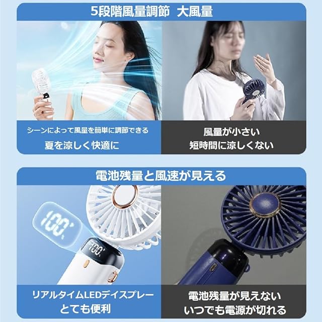 【低騒音&5段階風量切替】最新のブラシレスdcモーターを採用して、従来型より騒音を80%減少されるし、耐久性も高くて、省エネ、静音といった優れた特徴を持っています。弱モードでは運転音は20デシベル程度と低く、図書館やオフィスにも、周りの人に迷惑をかける心配はなく、いつでもどこでも夏の涼しさを楽しみます。ハンディファンはシーンによって5段階の風量が調節できます。(1-4段階は弱から強の順番、5段階は自動で風量が1-4段階を循環します。)どの段階でも長押しすればOFFになります。