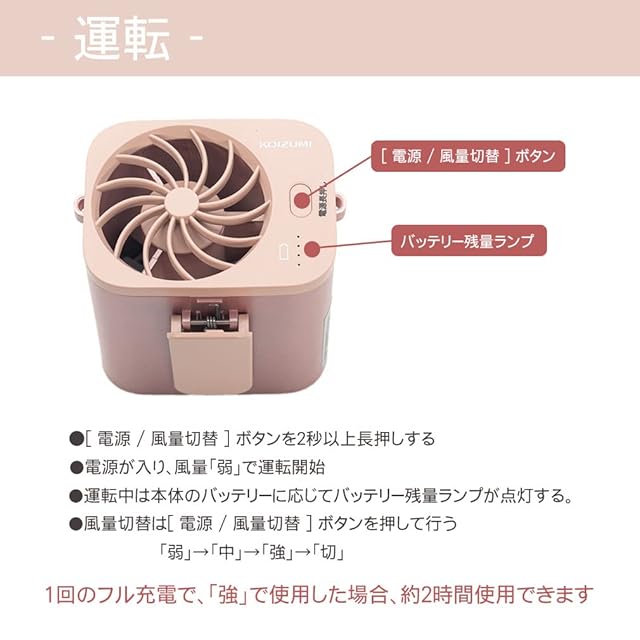 卓上でも携帯型でも使える2WAYタイプのハンディファンです。 風量は3段階で調節可能です。