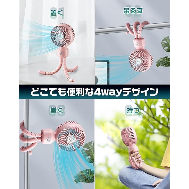 【どこでも使えるポータブルファン】従来の携帯扇風機と違って、タコの脚のような設計され、柔らかくて巻き付け自由自在です。卓上・吊り下げ・ハンディ・巻き付け全て対応、テーブルはもちろん、寝床・車後部座席・車シート・テントなど、場所を選ばず活躍いたします。