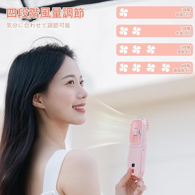 【180°角度調整可能・四段階風量調節・軽量で携帯しやすい】180°折りたたみ式のデザインで首を自由調節が可能になり、自分にぴったりの位置で涼しい風を楽しめましょう。電源スイッチを押すたびにファンの風量は「弱」・「中」・「強」・「循環」の4段階で、好みに合わせた細かい冷却調節ができ、熱中症/化粧崩れ/汗のべたつき夏場の様々ま悩みを解消、日常使用に充分。携帯性を重視する小型デザイン、180°折りたたんだ状態の大きさは9*8mm、約130gと軽量なので、バッグまたはポケットの中に入れても負担はありません。空間の節約になり持ち運び便利です。